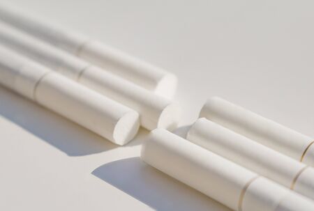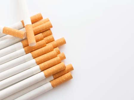 Many white cigarettes with a brown filter chaotic arranged on a white background. Smoking is blicking bad on health. Cigarettes worsen the work of the brain nerves