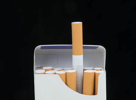 Open pack of cigarettes on black background. Open pack cigarettes. Orange filter from classic cigarettes. Nicotine addiction concept. Tobacco products. Bad habit. No smoking. Close-up