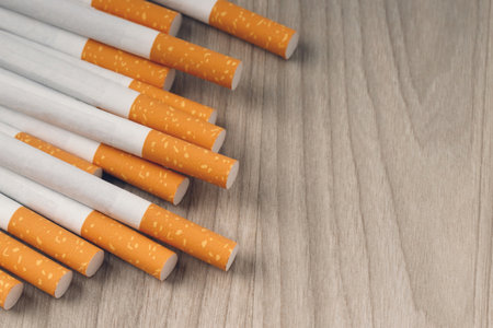 Top view of multiple commercial cigarettes arranged on wood for non smoking campaign