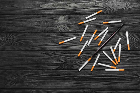 Many cigarettes on wooden background. Concept of addiction