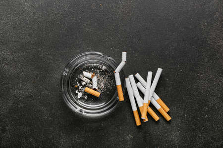 Cigarette in ashtray on dark background. Nicotine addiction. Bad habits concept