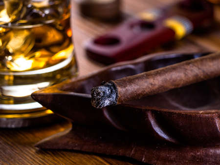 Glass of whisky on the rocks and a cigar in a wooden ashtray
