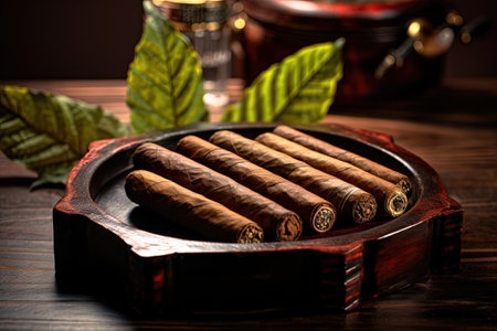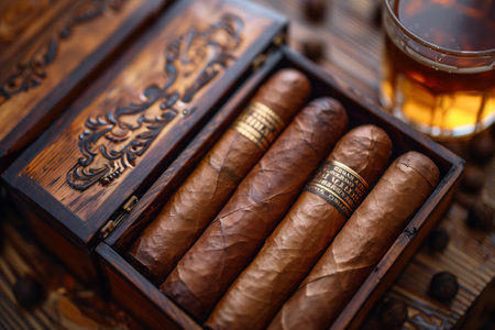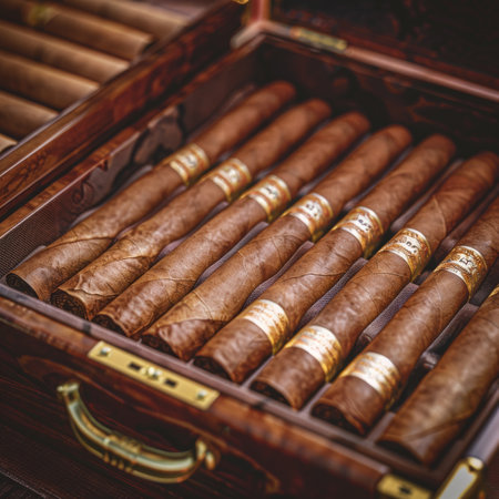 A selection of handcrafted premium cigars lying on a beautifully grained wooden surface. The scene features elegant accessories such as a bronze ashtray, a leather cigar case, and a decanter of fine brandy. The rich, earthy aroma of quality tobacco envelops the area, creating a luxurious atmosphere.
