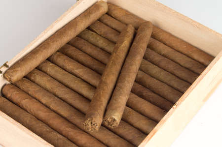 Cuban Cigars in a Row. Cigar Background. Wooden Cigar Box on the White Textured Table Top View