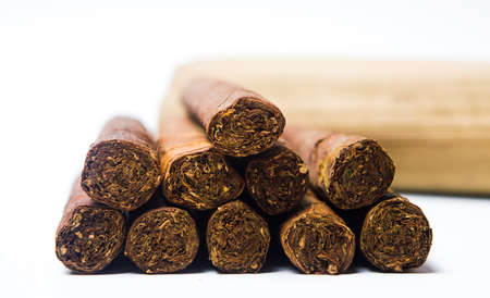 Box of cigarillos on a white background. On the box is one cigarillo. Selective focus. Close up