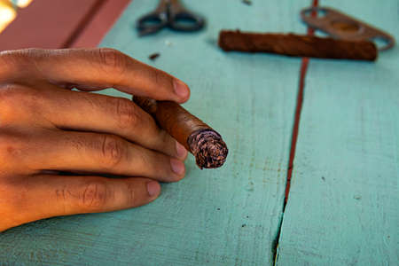 man holding cigar and tobacco leaves. traditional process of making cigars in close-up. valley of Vinales Cuba. Ingredients and tools for producing cigars on the table.