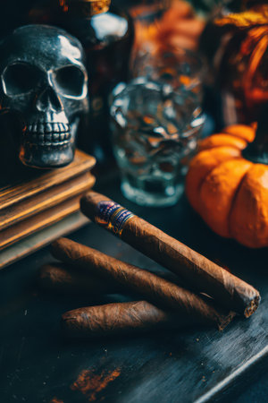Three cigars laid on a table with a skull pumpkin glass and books creating a moody fall atmosphere during an evening gathering.