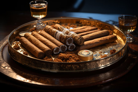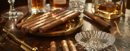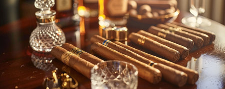 A collection of handcrafted premium cigars arranged on a polished wooden surface. The scene includes rich, luxurious details such as a gold cigar cutter, a crystal ashtray, and a bottle of aged whiskey. The aroma of fine tobacco fills the air, creating an atmosphere of sophistication and indulgence.