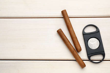 Cigars and guillotine cutter on white wooden table, flat lay. Space for text
