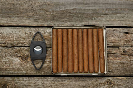 Cigar and accessories on a wooden table desk, closeup view. Cuban quality cigar tobacco smoking luxury lifestyle.