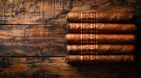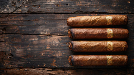 Top view of hand-rolled Havana cigars on a wooden table, A place for text or advertising.