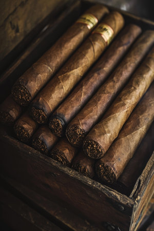 Vintage cigar manufacturing in a wooden humidor with handmade cigars