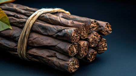Tobacco leaves rolled and tied in bundles, photographed under soft studio lighting on a dark background.