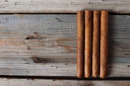 hand-rolled Havana cigars on a wooden table, a place for text or advertising.