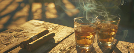 Two glasses of tequila and a cigar on a wooden table. Concept Tequila, Cigar, Wooden Table, Relaxation, Enjoying Life.