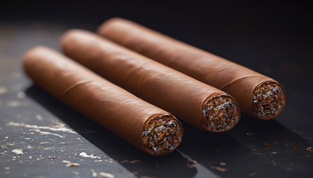 Three cuban cigars are laying on a dark surface, casting strong shadows