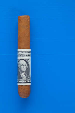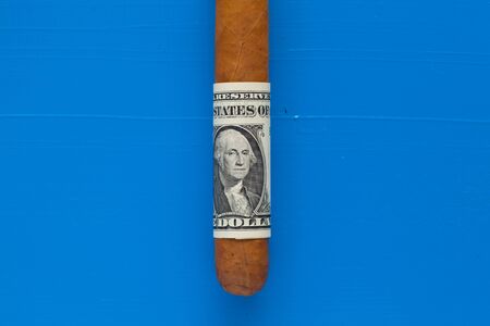 Detail of luxury Cuban cigar with US dollar on the blue desk