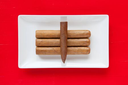 White ceramic dish with luxury Cuban cigars on over red background, rectangle dish