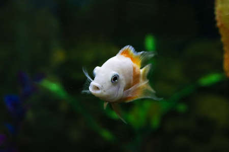 White fish in the aquarium in dark water close up