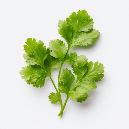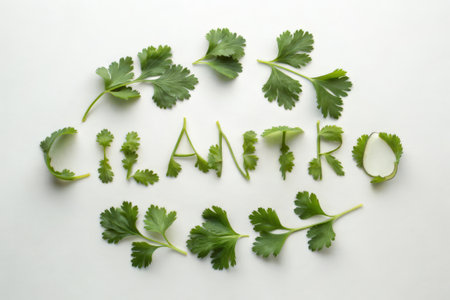 This image showcases fresh green cilantro leaves arranged elegantly against a white background, ideal for culinary uses in various dishes and garnishes.