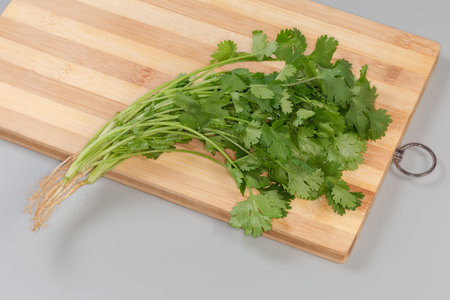 Bunch of the young cilantro with stalks, leaves and roots on the wooden cutting board on a gray background