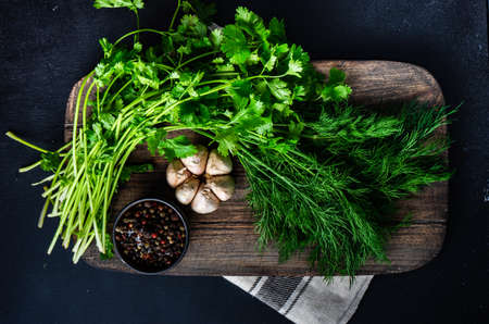 Fresh coriander leaves on a dark background. Copy space.