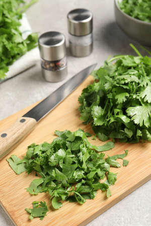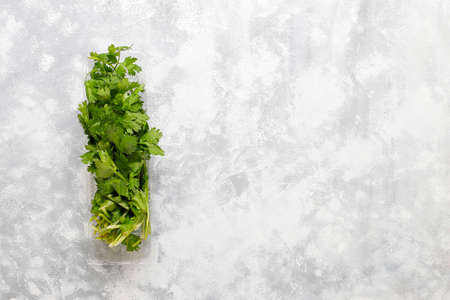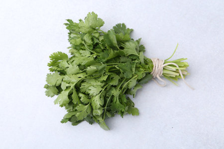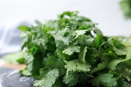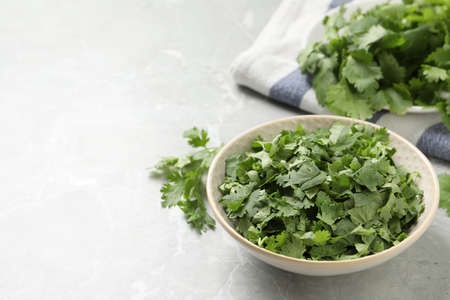 Fresh green cilantro on light gray marble table. Space for text