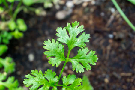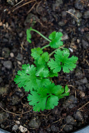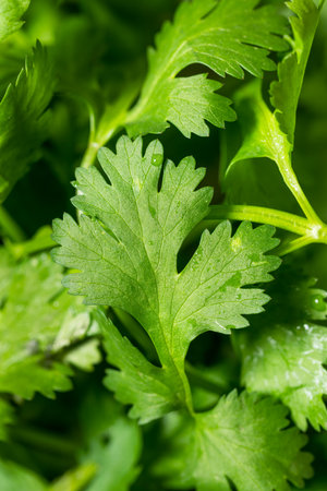 Coriander leaves in a vegetable garden for a notion in food health and agriculture. Background of organic coriander leaves