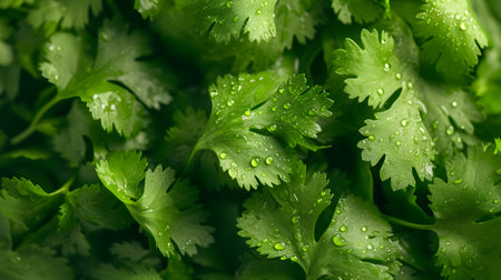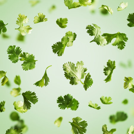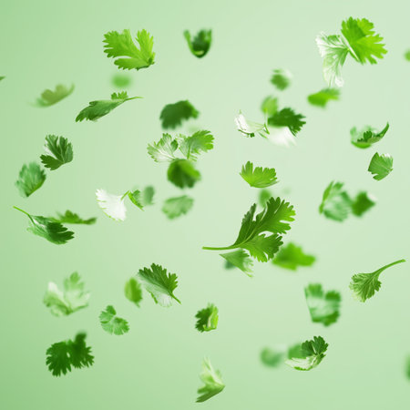 Fresh cilantro leaves floating against a soft green backdrop create a vibrant, lively atmosphere