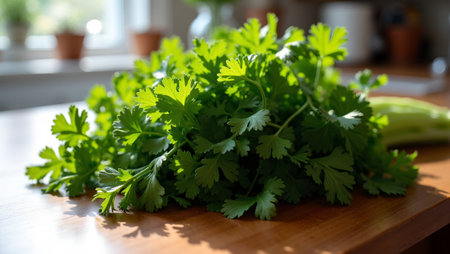 A vibrant bunch of cilantro rests on a weathered wooden table, illuminated by soft sunlight, creating a visually appealing scene for food-related content and healthy lifestyle themes.