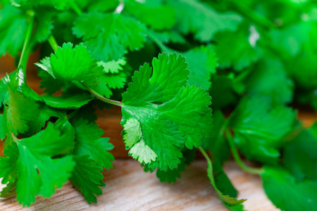 Fresh bunch of cilantro on a wooden surface