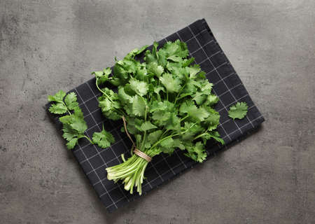 Bunch of fresh aromatic cilantro on gray table, top view