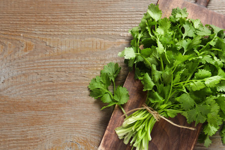 Bunch of fresh aromatic cilantro on wooden table, top view. Space for text