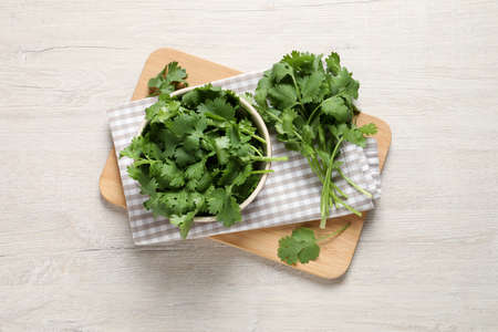 Bunch of fresh aromatic cilantro on white wooden table, top view