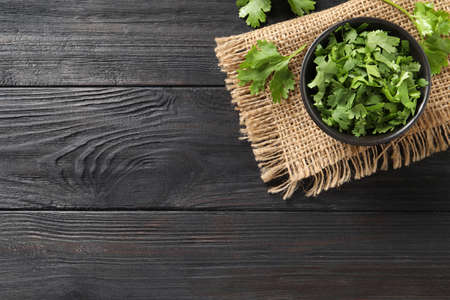 Bowl with fresh cilantro on wooden background