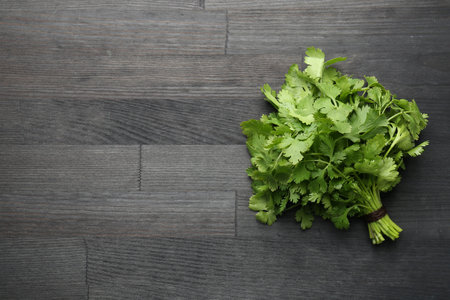 Bunch of fresh coriander on black wooden table, top view. Space for text