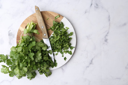 Fresh green cilantro and knife on white marble table, top view. Space for text