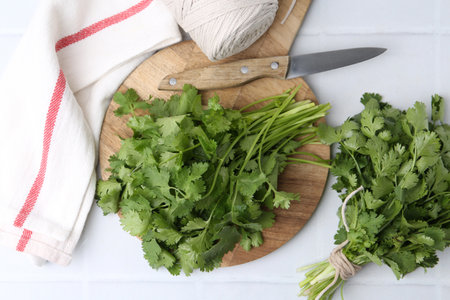 A fresh bunch of cilantro tied neatly with twine, displaying its vibrant green leaves. Perfect for enhancing flavors in various dishes and garnishes.