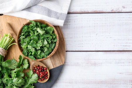 Fresh green cilantro and peppercorns on white wooden table, top view. Space for text