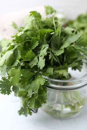 Fresh aromatic cilantro in jar on white table, closeup