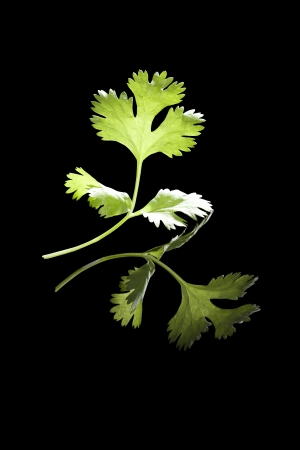 Cilantro leaf isolated on black background. Culinary aromatic herbs.