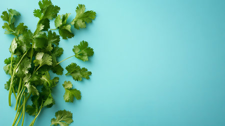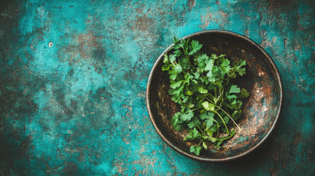 Fresh green cilantro leaves are artistically arranged in a rustic bowl on a vibrant turquoise backdrop, creating a beautiful and flavorful focus for food photography.