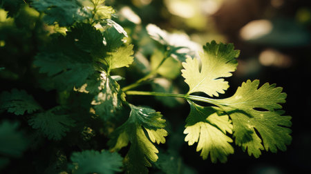 The Cilantro in spring, fresh green leaves, soft sunlight filtering, vibrant atmosphere full of vitality, natural textures, serene mood.
