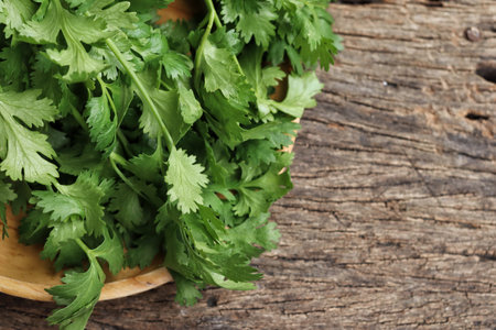 Cilantro in wooden box on wooden background close