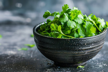 Fresh Green Coriander Leaves in a Black Ceramic Bowl on a Dark Rustic Table, Healthy Culinary Herbs Concept AI Generative