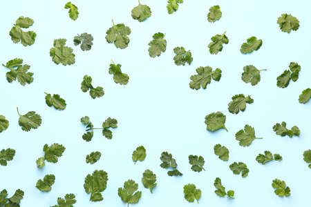 Coriander leaves on blue background. Flat lay, top view