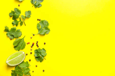 Fresh cilantro, lime and peppercorns on color background