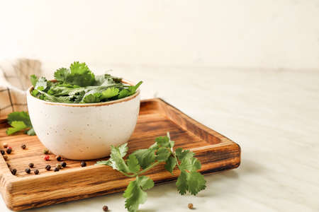 Board with fresh cilantro and peppercorns on light background