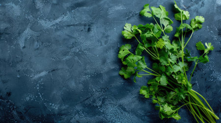 Fresh cilantro leaves on dark textured background