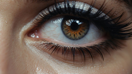 Detailed close-up of a human eye, featuring vibrant iris colors, a dark pupil, and delicate eyelashes, emphasizing the intricacies of human anatomy and vision